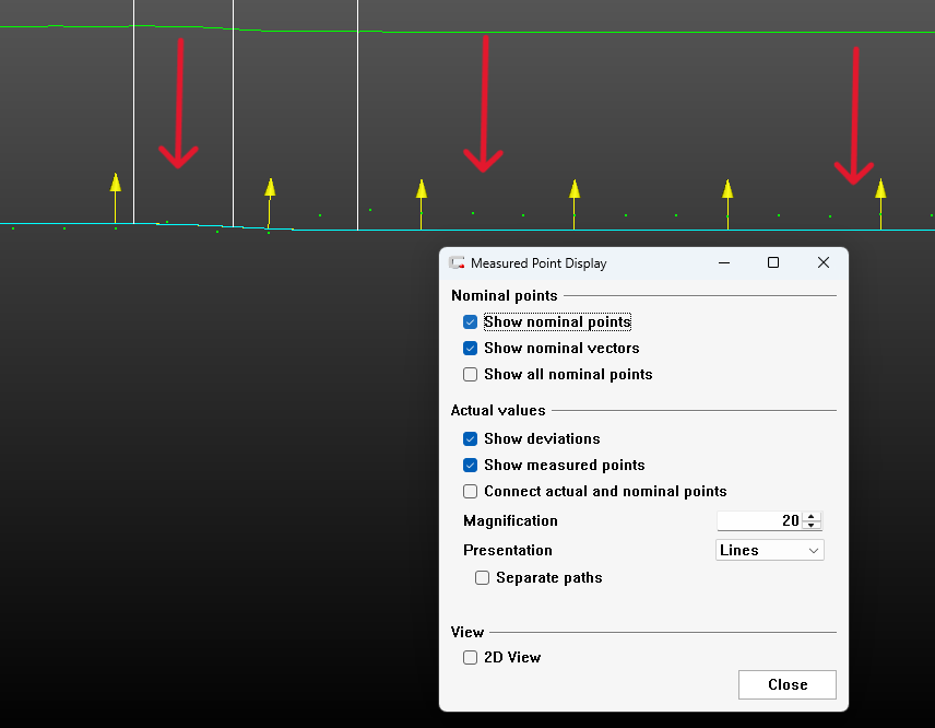 Good afternoon everyone, I am having troubles when evaluating 2D curve via Measured point display. We recently switched from Calypso 2020 to 2024 and prior to that we used the measured point display when instructing operators on depth adjustment using distance between points. I can still kind of use this method, but it is much harder to visualize using the radii of the two lines. As you can see in my attachment, even with "lines" selected, it displays dots and pushes the line far above the CAD model and its true location. When I lower that "20" magnification to "1" it just reduces the dot magnification. Red arrows indicate where I want the line to go. 😒 What happened to these lines?