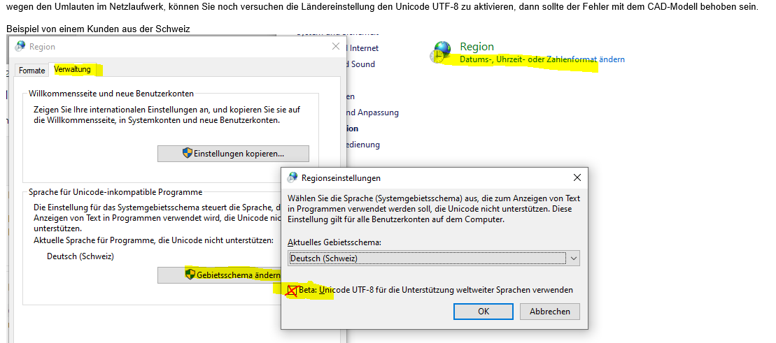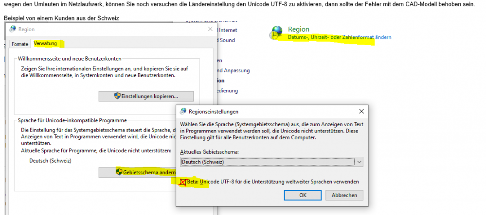 Hallo Yannick, wir hatten ein ähnliches Problem nach dem Update auf 2023. Da konnten wir keine Programme mehr mit CAD Modell Speichern. Wir hatten in unserem Speicherpfad für die Messprogramme vorher immer mit Ü Ä abgespeichert. Das wollte Calypso 2023 nicht mehr. Darauf sagte Zeiss wir sollten den UTF 8 Code einstellen. Wir habe unsere Problem jetzt aber so gelöst, das wir keine Umlaute mehr verwenden. Seit dem ist alles i.O. Aber vielleicht hilft ja die Einstellung bei Dir.
