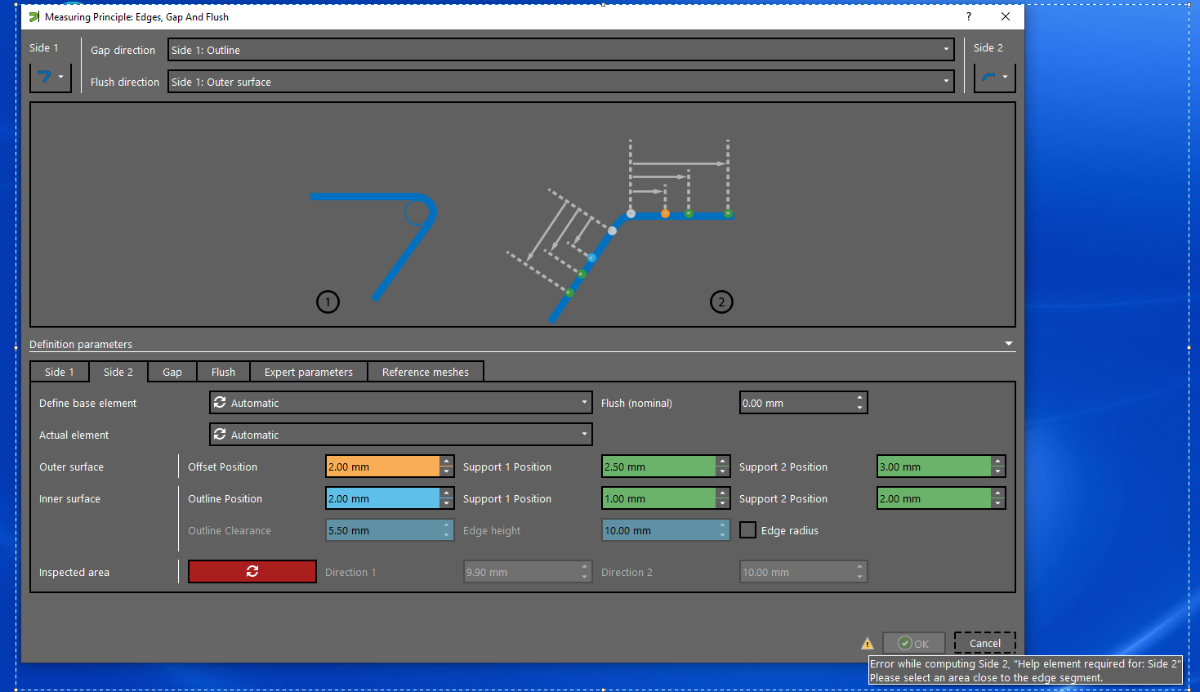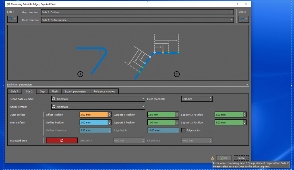 Hi Štefan, please make sure to have side 1 and side 2 in separate parts in the project and try to use the measuring principle again. There are some rare cases, when the automatic creation of the base point on side 2 does not work. In this case please construct a base point manually on the same plane as the point you are using the measuring principle at and define it in the dialog. Easiest way is to use an edge point at side 1 and click the base point on a section, which is defined by the plane of the edge point side 1. When the measuring principle is applied to a curve, a manually constructed curve on side 2 may help analogous to the manual constructed point. If this workaround is necessary, it would be nice to have the sample data available for analysis. So please contact your local support and refer to this thread Get in touch with our team | ZEISS Industrial Quality Solutions Nanno