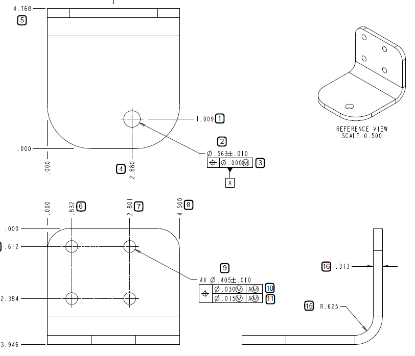 I have several questions about the position callouts in the attached print. I have no idea how to tell the CMM what I need here. 1) The position callout on the .563 hole (item 3) does not have a datum. I assume it must be referring to the 1.009 and 2.880 locations from the sides, correct? So I should use those two edges as my datums when I set it up? 2) The composite tolerance on the bottom (items 10 and 11) only lists datum A, which is the hole from question 1. I don't have the CAD model, but I assume if I get it, it will pull in the correct nominals. Wouldn't it need to consider all 3 directions (X, Y, and Z)? I have never done position with more than 2 directions. Is that even possible? Would I have to do the holes as cylinders? Or would I scan the holes and project them to the faces? If projecting to the faces, would I use the inner or outer faces since the material thickness could vary? For the top line, I believe I would have a separate position characteristic for each hole within .030(M), as that is how I would do a regular position. For the bottom line, my understanding is that would control the position of each of the 4 holes to each other. I am confused because I thought the bottom line was supposed to have less datums, but both lines only have datum A. If the bottom line is controlling the holes to each other, what does datum A have to do with it? How do I make the characteristic(s) for the bottom line? Is there a singular characteristic that takes care of the whole pattern or would that need to be separate for each hole as well?