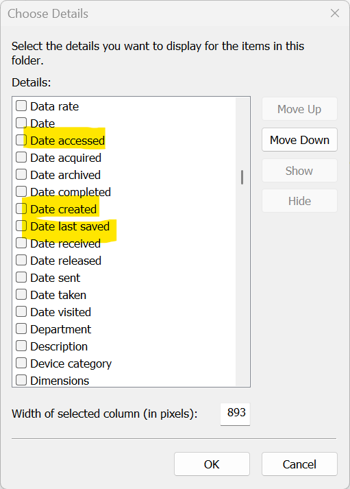 @Jens I wouldn't go making changes to the Windows registry for an issue like this. In your Windows file explorer window, you should be able to right click at the top where you see filename, date modified, size, etc. Go down to "More..." and you should be able to add and remove the appropriate date header you need. So instead of "Date modified" you might want "Date last saved."