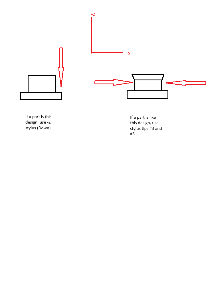 When building a stylus with movable parts, what is the trick to getting the movable parts at the correct angles? And how critical is it?-Unfortunately, the biggest trick is practice, especially with XXt styli, but the methods described by other users here can help make it easier. How critical the angle is is dependent on the measurement: how far into the part you need to go (the further in the more precise you need to be), the size of the feature (especially hole diameter), and the ratio of the probe tip to the probe shaft diameter. All of these contribute to the potential for shanking the probe. I am building the stylus pictured. It can be rotated 360° (blue arrow) and the knuckle can bend back and forth as well (green arrow). Let's say that when the RDS is at 0°/0° I want the stylus to face forwards towards me and be lifted up 45° towards me. How do I ensure that it is exactly centered / forward and exactly 45° up? What if it is not exact? How far away from that can I be before it creates an issue? The way to ensure it is exactly centered is to set the probe through whatever method you choose above, then check the angles on a CMM (ideally the exact one it will be used on, to account for any slight variances in the systems) using the method Chad describes above. I personally will do a quicker version of this check as a go, where I will take 2 points on a sharp cornered object (such as as machinist block) as a quick check, then adjust until I am happy with the result, at which point I will do the full cylinder check. How far away from nominal you can be depends on the factors above, I personally shoot for under +/-0.1degree on most probes, but your actual acceptable values will vary. What angle does the reference sphere have to be at in order to qualify it without a collision? So far our reference sphere has always just been straight up. The reference sphere can be set at various angles, so long as the stylus being calibrated can access the sphere about the equator without any component hitting (The angular coverage of the sphere can be adjusted for VAST systems if necessary, dependent on if the calibration is Geometry, Tensor, or Dynamic Tensor). An easy way to ensure this is to effectively point the sphere and stylus at each other. If they make a straight line through their axes, then it should be able to access, but this is not the only viable angle set. If I have to change the angle of the reference sphere, how do I ensure it is at the correct angle? If you choose to, you can measure the exact angle of the cal sphere by measuring a cylinder along the shaft of the cal sphere, but often times you can get close enough for successful calibration with a little care and manual setting(you can probably eyeball it close enough to a 45deg rotation to work, and the tilt is typically controlled by the cal sphere stand, so that should be close as well) When I go to qualify it, if it does the thing where it guesses what angle the probe is at, but it's not what I intended, do I change the values to match what I intended, or do I adjust the stylus and try again until it matches? This depends. The guessing what angle thing can happen because the probe is too far off, but more often it occurs because you did not probe close enough to the centerline of the sphere while travelling in the direction of the axis of the probe. So ideally, you should confirm your stylus is correct via the method described by Chad above, then you would know that the error is in your manual probing and should be able to be dealt with by inputting what the values should be. Do be careful as sometimes what Calypso guesses you intended those angles to be may have a different sign than you expect, which can cause confusion. You'll usually know if you had a sign issue as soon as it starts calibrating though, it won't probe even close to along the probe shaft axis. Proper calibration start should visually be probing along the axis of the probe, and the initial point(s) should point to the center of the sphere (mostly, the CNC cal doesnt do this exactly for technical reasons, but it is still close) What if in the future I wanted to use this same set up but have the knuckle point the probe at 30° rather than 45°. I imagine I would need to create a whole new stylus system, correct? But wouldn't that require a separate adapter plate so that the CMM would recognize whether it was the 30° setup or the 45° setup? Would it make more sense to leave this one the same and buy an identical setup and make a whole new configuration? This also depends. You would normally want to create a new stylus system in Calypso for the 30deg angle, not just update your existing 45deg one, but there are cases where updating is the right option(the probe created just for Hole27 was at 45deg, they changde the part and now hole27 is cut at 30deg instead of 45 for example) . If you never intended to use the 45deg setup again, you could simply delete it out of Calypso, and then make a 30 deg probe configuration with the existing adapter plate and teach that into Calypso. If you want to have both a 30deg and a 45deg setup, yes you should have 2 different adapter plates, as fully separate physical configurations as well as separate entries in Calypso. Regarding buying new tooling and making a whole new configuration, I would say this is the best option for common or frequently used configurations, but it may make sense to tear down and use components to build new probes for short term use or one off tools. Personally I am not a fan of reusing those knuckle joints, too many cycles of adjusting them can wear them out to where the no longer hold angle very well. There are a number of videos, articles, and guides which may be useful to you on these topics and others. All of these can be found here on the Zeiss Portal, but you can also find much of the video content on the ZeissIQS youtube channel, which may be easier to search videos https://www.youtube.com/@ZE