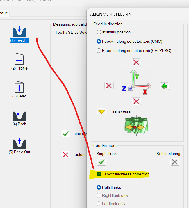 Hi, in general the searching distance possibilities are limited in the case you describe. First you can try to activate "tooth-thickness correction" at feeding-in (attachment). Alternatively you could think about measuring in self-centering double-flank contact mode? Maybe this works better for this case with high eccentricity deviations.