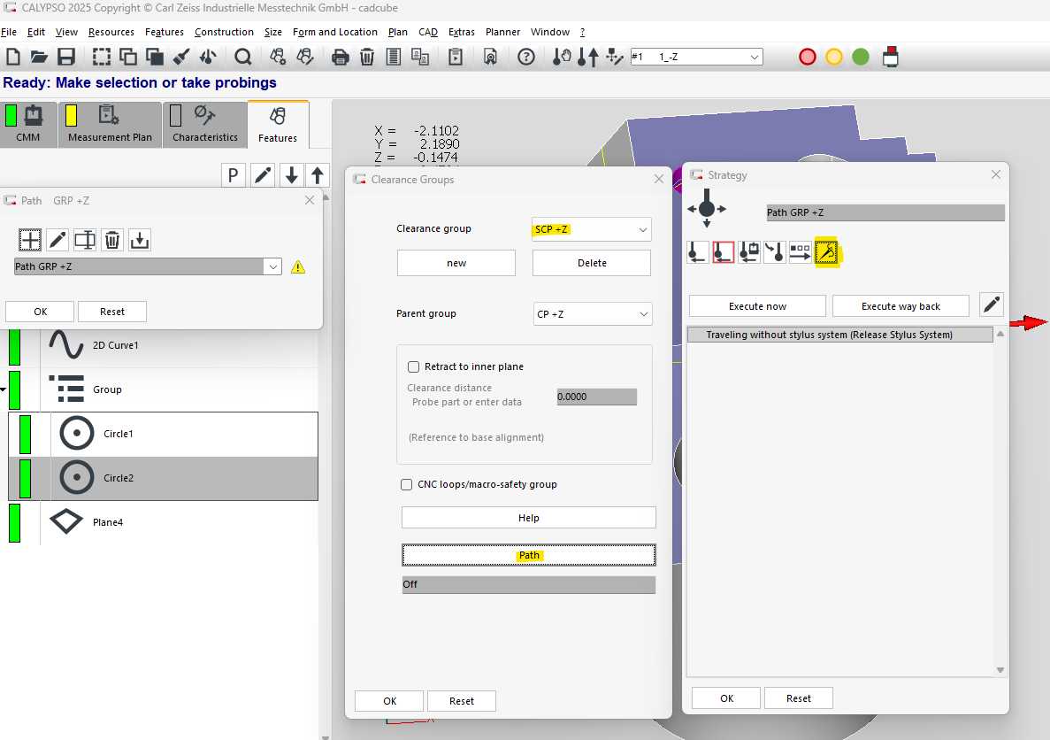 This feature is available for use in CALYPSO 2025 (8.0) and referenced in the Operating Instructions which I have attached - Editing the travel paths section (6-97). It is called Path for "threading" without stylus system section 6-115 If you want to measure one or several features in a hollow space (cavity) whose entry is too small for the direct travel path of the stylus system, the stylus system must be removed and mounted again by hand inside the cavity. For this to run smoothly in the CNC run, you must create a path for threading without a stylus system with stops for removing and reattaching the stylus system. For this, use the path feature “Threading” During the CNC run, CALYPSO stops in front of the cavity. You can give the command in CALYPSO as well as on the control console to release the stylus system and prevent the stylus system in the CMM from falling down. CALYPSO continues the measurement run and positions the probe in the cavity. A message is displayed that the stylus system can be reattached. After the attachment, CALYPSO continues and the path is executed to the end. The features in the clearance group inside the cavity are measured and the path is executed backwards. Calypso_basic_cnc.pdf