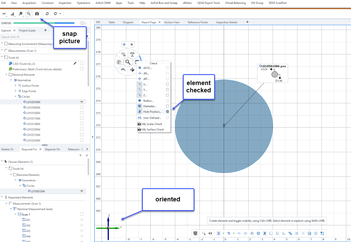 Hi, 'hole position' is a dedicated check in I-Inspect. You need to check the Circle, slotted hole etc. with it. The values are shown in the label, when the 3D view is oriented to one of the directions (click on middle of cube or one of View -> Standard view in the menu, you may use a local coordinate system for viewing). When the 3D view looks good for you, create a report page with the camera symbol.