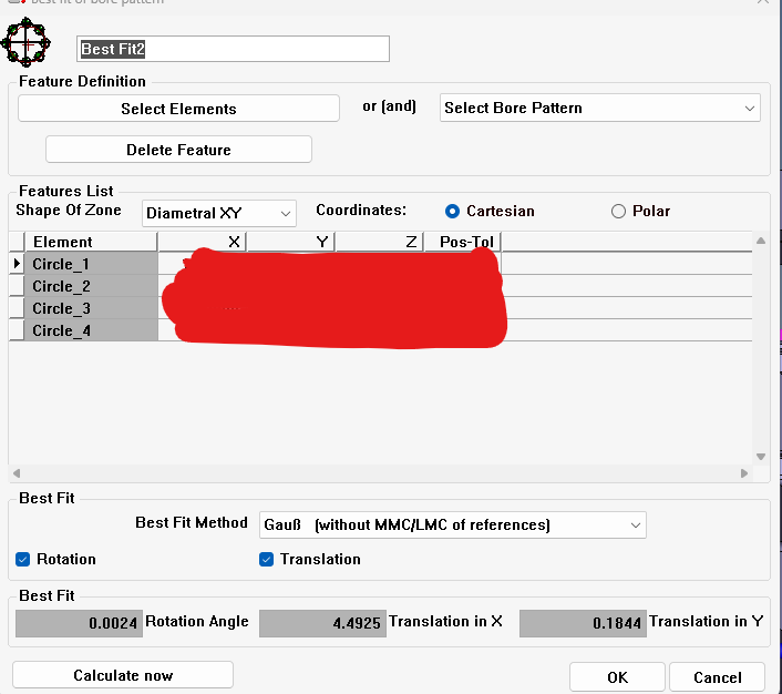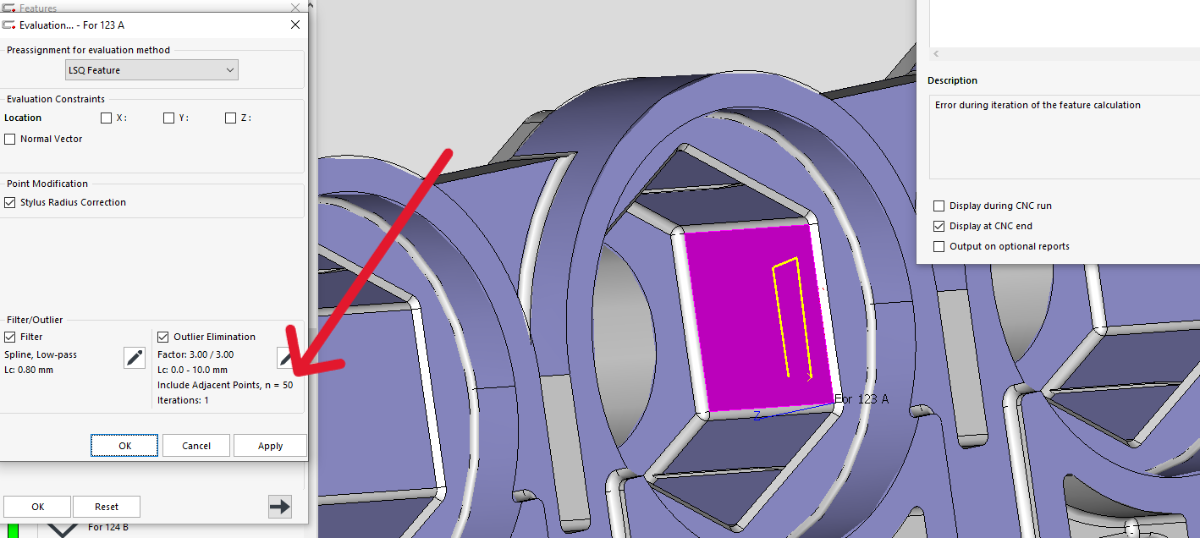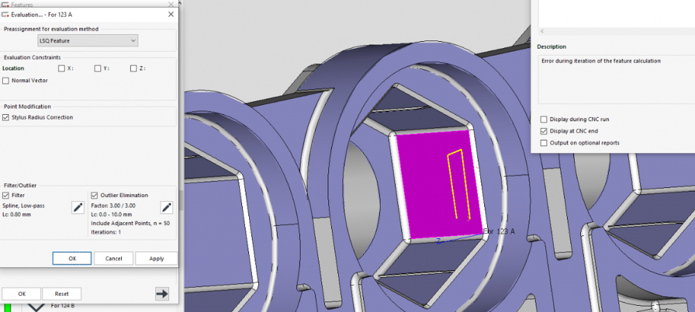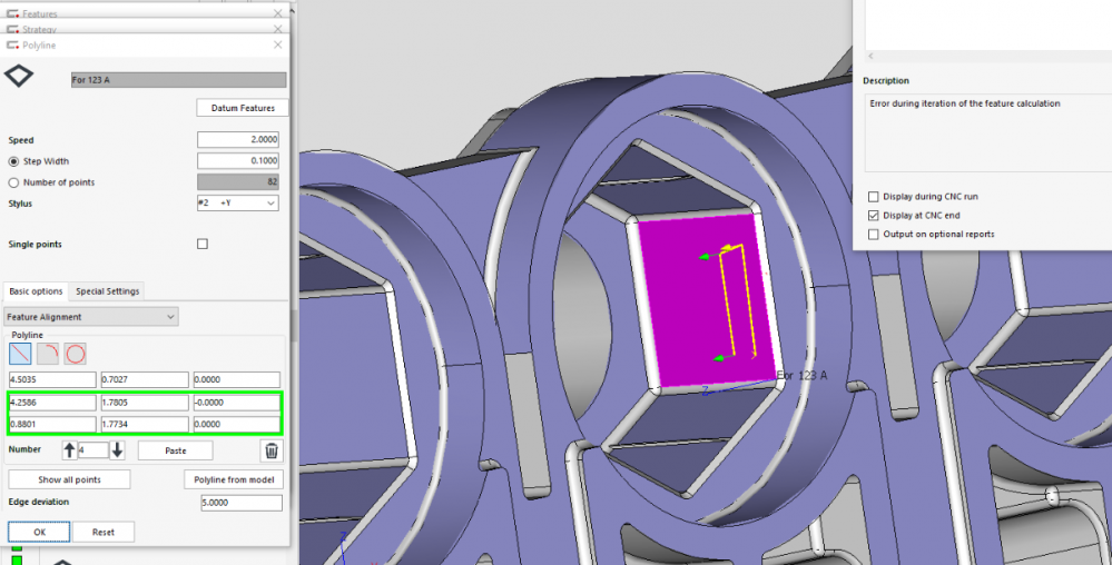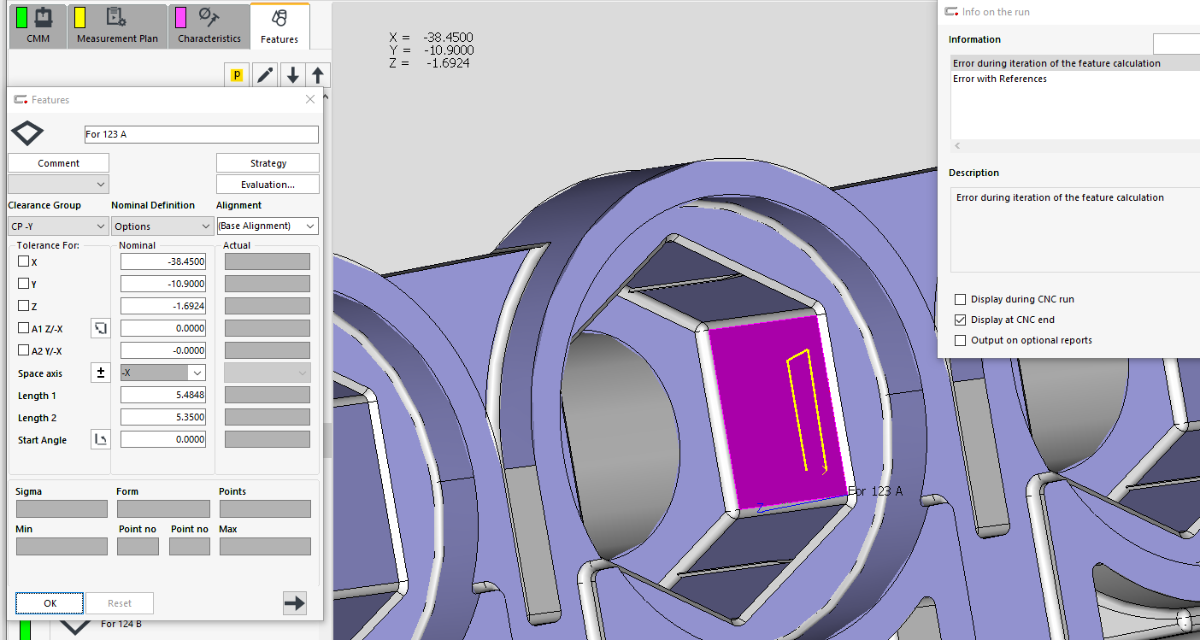 I have 3 angles that won't calculate and are purpled. When I go to the feature of the plane, the strategy and evaluation are correct, and I can run the feature and the probe traces it normally, but it will not resolve the issue. When I click the polyline path of the plane feature it is showing points taken as normal.