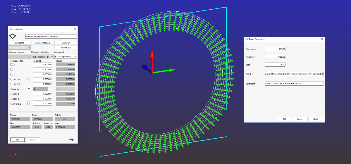 Collect the actuls by 3d-Curve and the surface by recall the points into plane PointGenarator 3d-Curve Start Index = 135 // ° End Index = 3735 // °; start angle + 5 revolutions Step = 5 // ° 10 // inner radius; constant 0.001 // gradient of the spiral 0 // nx 0 // ny 1 // nz perpenticular surface = parallel to Z-axis point(10*cos(index)+0.001*index*cos(index), 10*sin(index)+0.001*index*sin(index), -5, 0, 0, 1) Please play with the parameter to addapt it to your part Good luck -