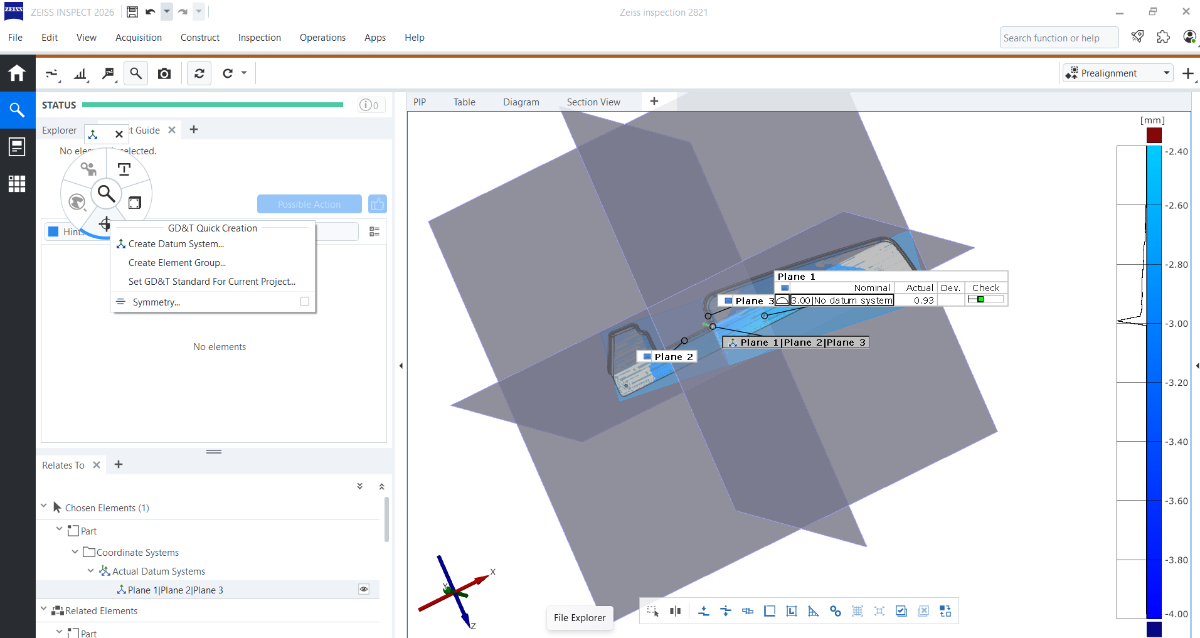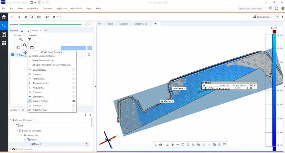 Hi, thanks for your reply! This is my first time using inspection software, so I don't understand everything yet, haha. The measurement principles are set up, and I can create my datum points, but I can't seem to get the results I want. Specifically, I need to compare a surface profile against a reference system. As you can see in the photo, I can check the surface profile without a reference, but once I have my reference point, the surface profile function in the GD&T Quick Creation menu no longer appears. I have something more to do ? Maybe my datum points are not right ? - Yesterday