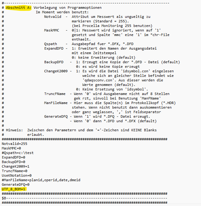 Hallo Matthias, aktuell liegt dazu ein BUG bei der Entwicklung vor, weil die "default" Ausgabe nicht funktioniert. Trage bitte in deiner qdasconv.con (befindet sich im Hauptordner von CALYPSO) folgenden Befehl ein: UTF_8_BOM=1 <- für Ausgabe UTF8 mit BOM oder UTF_8_BOM=0 <- für Ausgabe mit UTF8 (ohne BOM) Mit dem kommenden Patch wird der default als UTF8 mit BOM ausgegeben und kann auf wunsch über die qdasconv.con auf UTF_8_BOM=0 gesetzt werden um eine Ausgabe ohne BOM zu erhalten. Gruß Marcel
