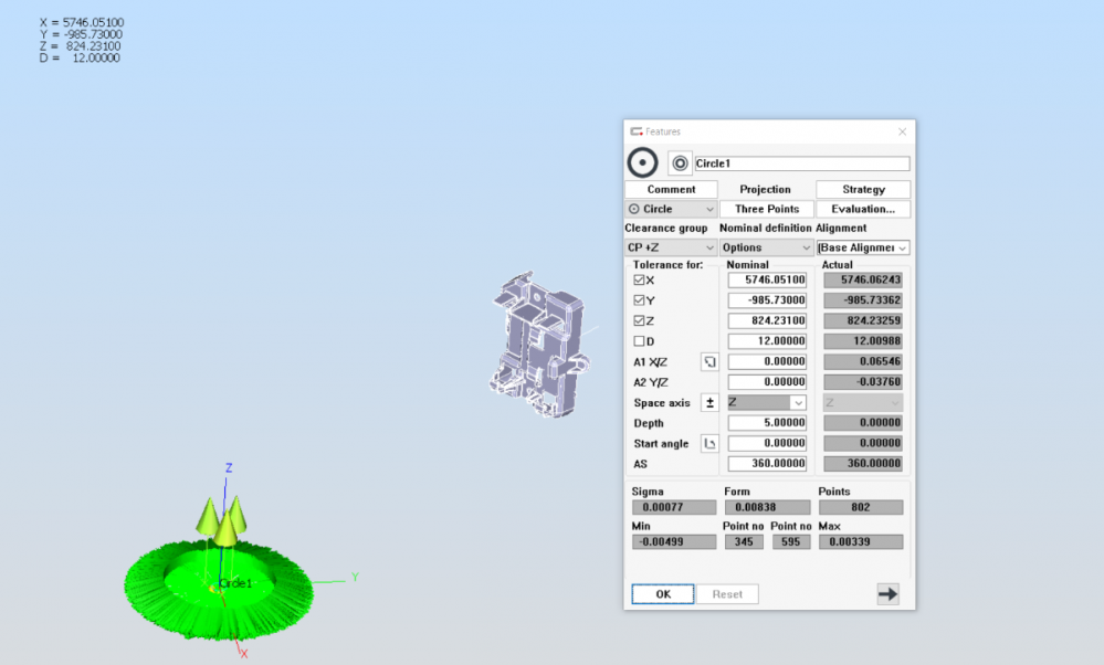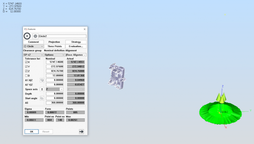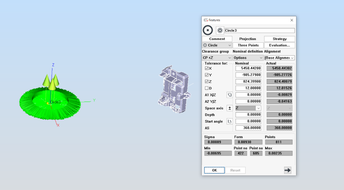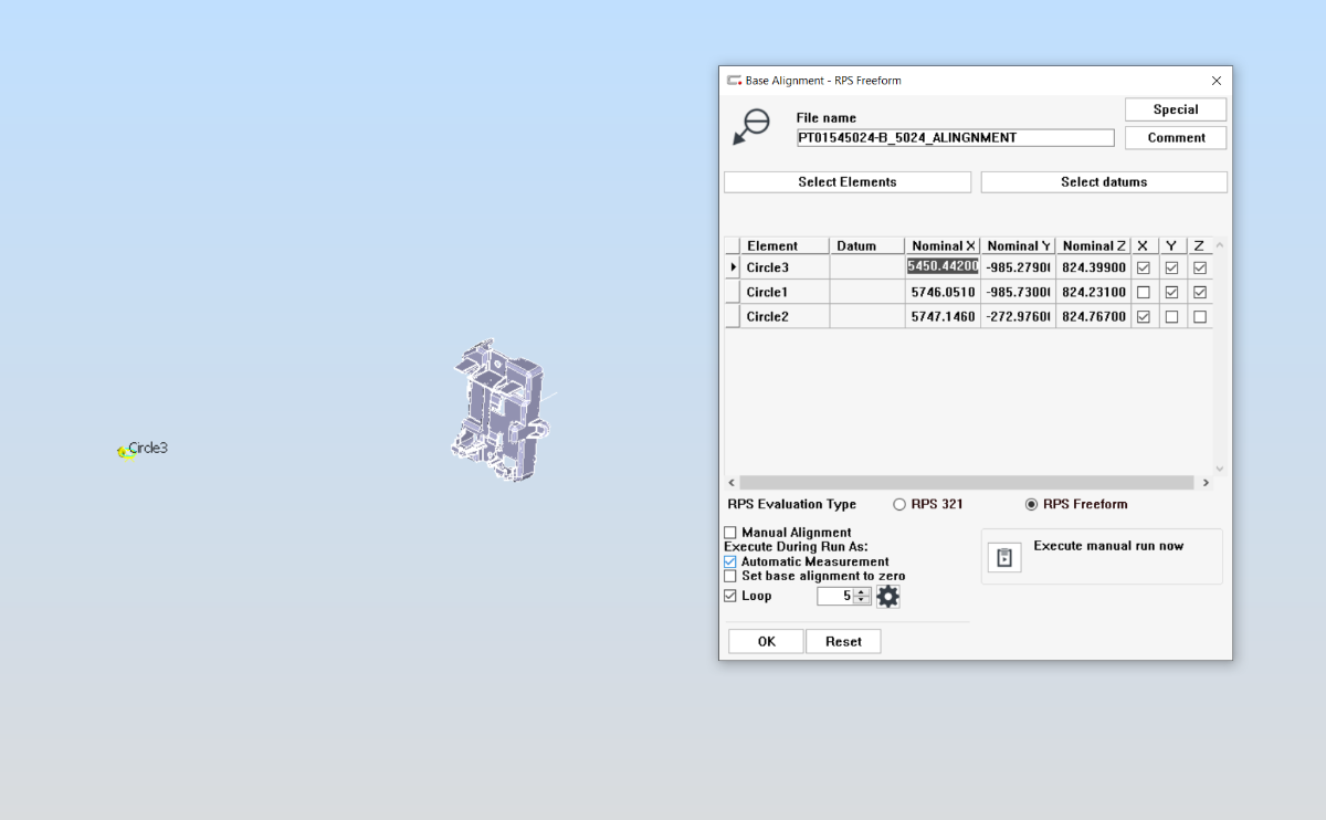 Hello everyone, I have a cad that is aligned to the circular bushings. created manual run first then auto run cnc using RPS free form method. However when trying to probe feature like circle true position looks good on the fixture, but by probing the deviation is too much is it because: 1) Cad is not aligned using circular bushings? 2) should i set base alignment to zero? I am new to Zeiss Calypso. I have also attached my RPS Free form alignment. Just adding images of the circle bushings created result after auto mode. Thank You