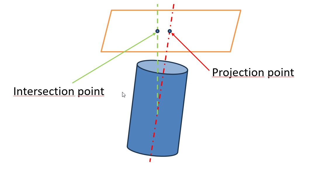 Intersection would be projected along the axis of the cylinder normal to the axis of the cylinder until it hit the surface you told it to intersect. Projection would be taking the axis of the cylinder and projecting it along the axis of the cylinder normal to the axis of the surface you told it to project to. if the two surfaces aren’t very square to each other then you would see vast differences.