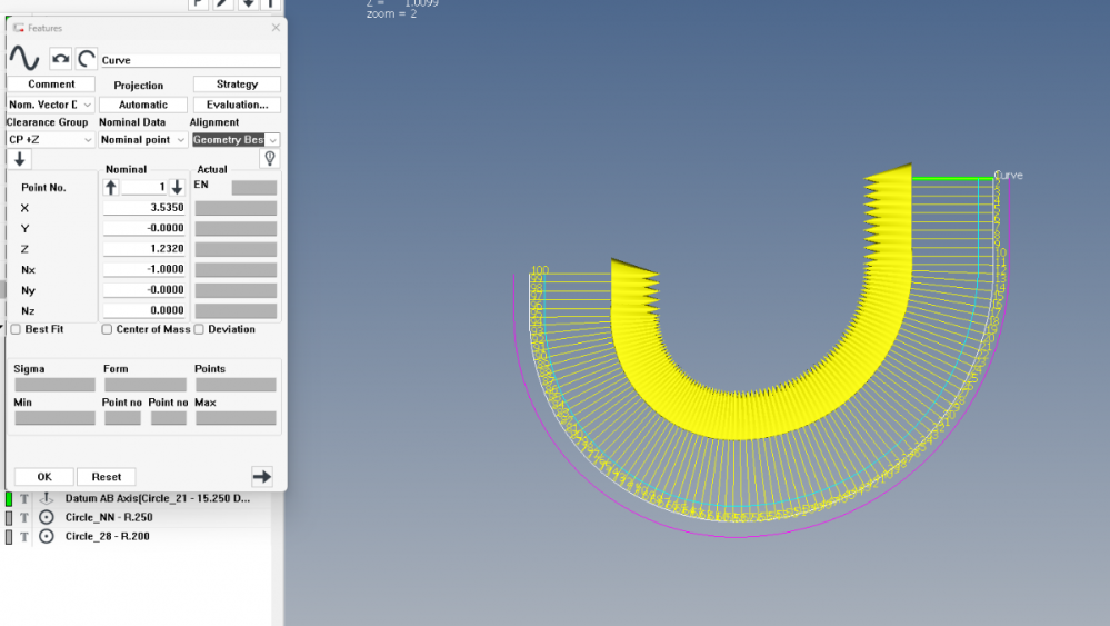 I should know this but my brain is a bit foggy. I have a face groove detail on a cylindrical part. View shown below is from the -Y direction. The Z depth of this groove has been problematic for reasons I don't know. The drawing is calling for profile of 2 radii within the curve. If I take a point in the -Z direction at the bottom, where the 2 radii are tangent, I believe that will give the curve enough information to locate it for measuring. Will a geometry best fit alignment from the point do the job?