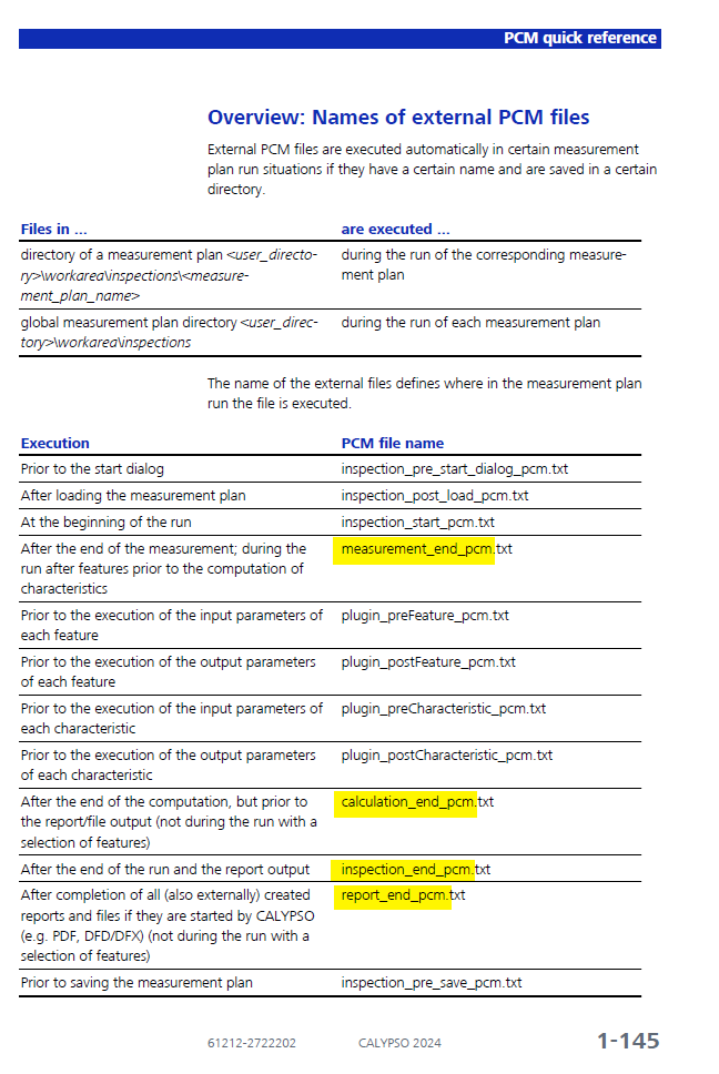 [Ch...] Posted September 2 Share Posted September 2 (edited) I agree with Andrew endInspection() is likely best here. Â Â There is also this to specify which Characteristics to report, in case the above does a full report and that is no desired :Â setElementsForProtocol() //Set characteristics to be printed in protocol and some more helpful commands, although these are listed under 'custom printout' :Â EDIT : These do not appear to be for PiWeb, a lot more info in the help file though for this. //Flexible printout controlled by PCM defineProtocol("#name","Pres for r&d") defineProtocol("#type","presentationProtocol") defineProtocol("#medium","pdf") defineProtocol("#elements","allCFOutTol") defineProtocol("#name","To me") defineProtocol("#type","compactProtocol") defineProtocol("#medium","ps") defineProtocol("#elements","allCF") defineProtocol("#name","For trouble shooting") defineProtocol("#type","compactProtocol") defineProtocol("#medium","screen") defineProtocol("#elements","allME") //Possible to set order: defineProtocol("#order","likeList") defineProtocol("#order","alphabetic") defineProtocol("#order","rangeOfTolAndDev") Â Edited September 2 Link to comment Share on other sites More sharing options...