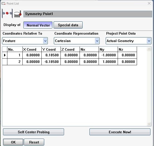 [To...] Posted September 25 Share Posted September 25 (edited) Touch points, including symmetry points will always snap to the closest primary axis. At a minimum, you can create a secondary alignment and use the special button to rotate about the Z axis until the plane is normal to X. Then, select CAD > Pre-assignment for New Features > select the new alignment and leave this window open. Next, create your symmetry points. Close and re-open the symmetry point. Click Strategy. Double click either of the Probing Points. Edit the X and Y of each point to zero to make the points directly opposed. Why the X and Y? Because the default "Coordinates Relative to" option will be relative to the feature, meaning the Z direction will be along the vector of the 1st point. In other words, you're looking at feature in the direction of the points. Because the points are related to the alignment, you can edit the Y and Z values to place the points exactly where you want. Edited September 25 2 Link to comment Share on other sites More sharing options...