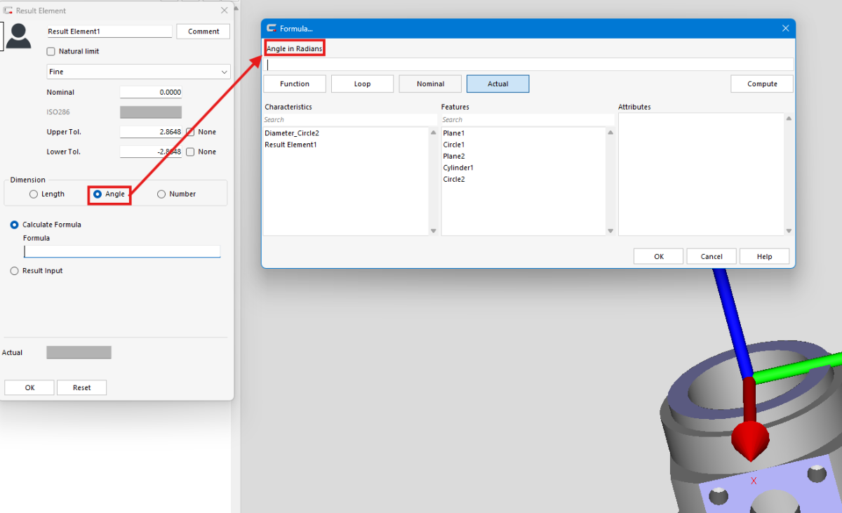 [Da...] Posted September 30 Author Share Posted September 30 From what I can see, I can only work in radians in the result element. That is why I was using a formula to convert this into degrees. I had not yet actually measured a part, but when I 'testing' the formula, it was giving me some very unrealistic results. As it turns out, the testing, and ultimately the actual result, only works when you have actual data. Once I actually measured the part, the formula I found (rad(90)- getActual("Half Cone Angle1").actual) does work. Link to comment Share on other sites More sharing options...