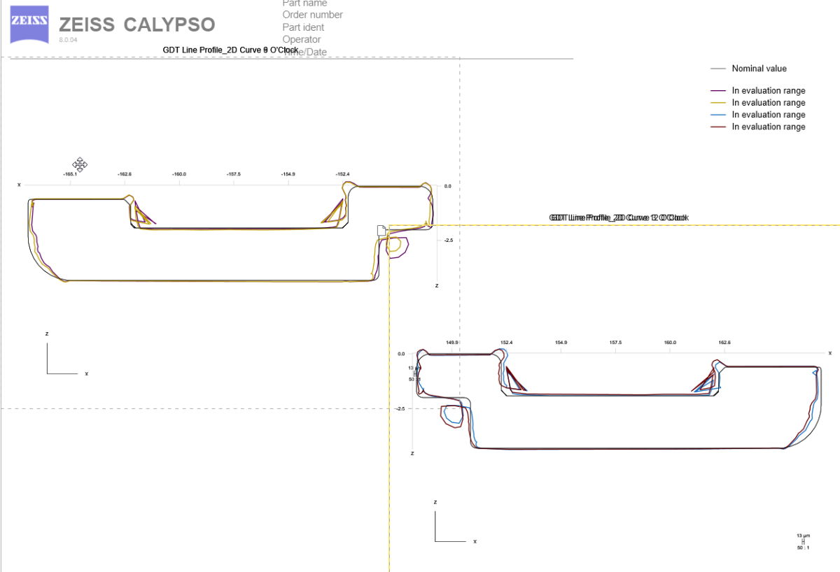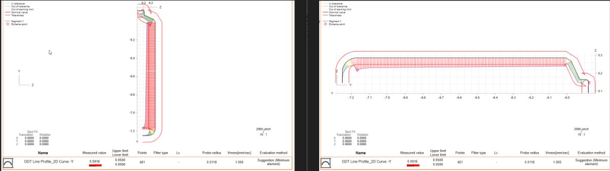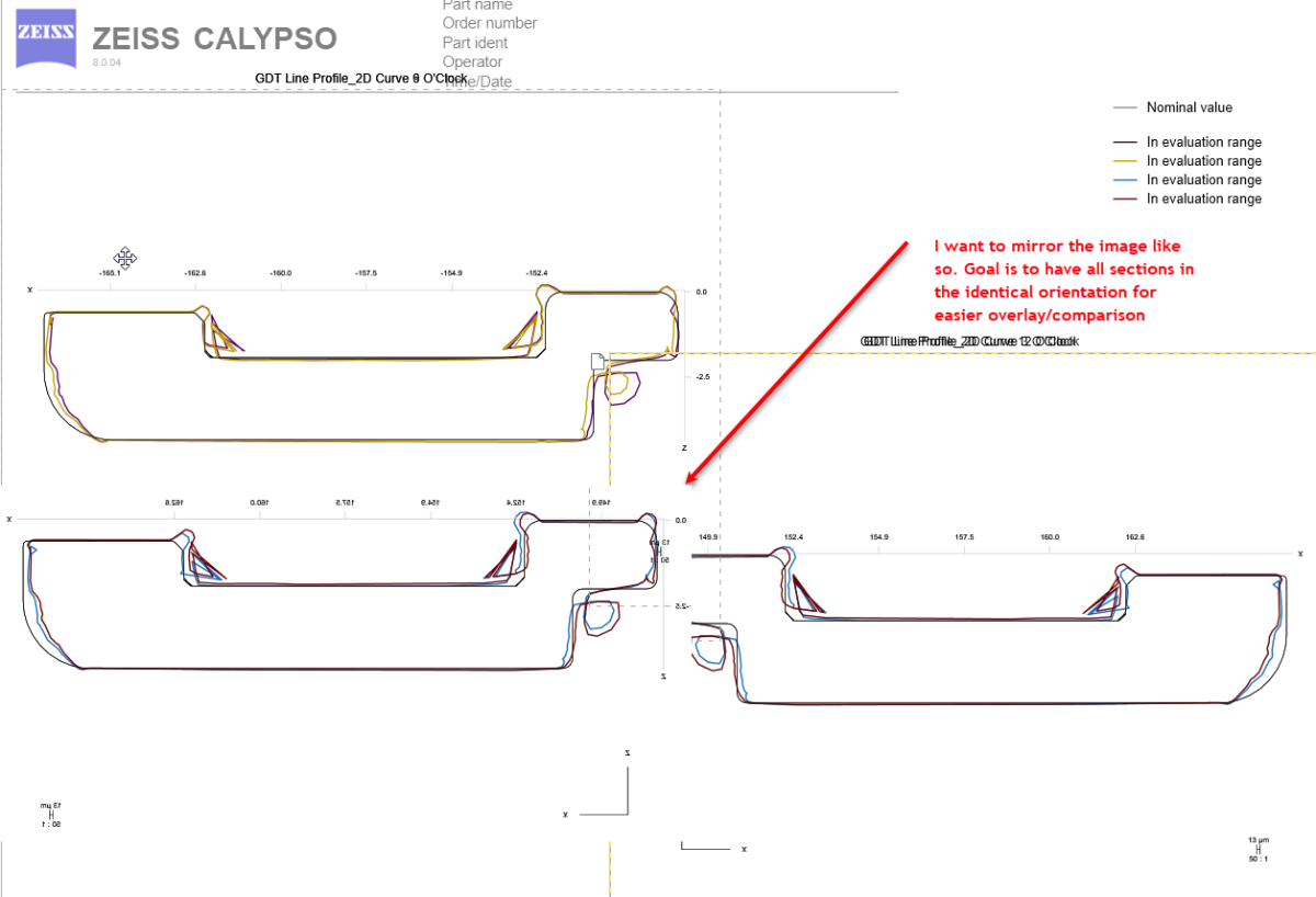[Iv...] Posted October 22 Share Posted October 22 Hi All Hopefully, I'm just missing a simple feature in the PiWeb Editor. We inspect a washer-like part, where we measure 4 line profiles at every 90-degree increments. Sometimes we may bump this up to 8 or 12 sections. After engaging further with the customer, I got a better understanding of how they digest the part. Their preferred method is to evaluate all sections together in one overlay so they can easily compare the deviation across each section. I was able to produce the below. But my issue was that half of my plots were a mirrored image of the others. Is there an easy way to mirror the plots so they can all be shown in the same orientation? Seems like an easy ask, but I couldn't find any setting to flip orientations? Also, flipping the axis of the plot would correct the orientation to the desired result. Alternatively, while I still like to get further insight into the above. I'm not sure if this is the best approach... as mentioned, we measure parts with increased sections. Would there be a process in the PiWeb settings to ensure that those plots are always in the correct orientation? I would like to avoid programmers having to go into the template editor in PiWeb since they are familiar with the interface. I also considered that within the profile characteristic, we can apply a special rotation to the profile so that all profiles are in the same orientation. This would leave programmers in the Calypso realm, where they are more comfortable. Thoughts? Lastly, for the table of contents. Can you change the "In evaluation range" text to refer to the profile name instead? I really appreciate any help you can provide. Link to comment Share on other sites More sharing options...