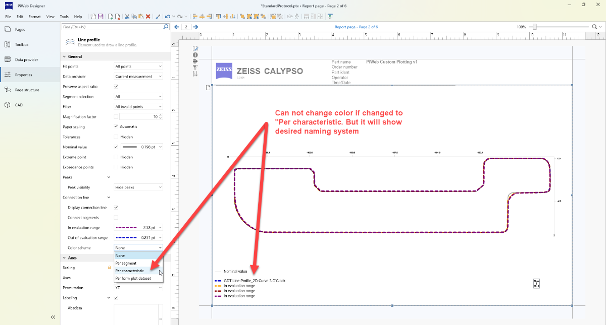 [Iv...] Posted October 23 Author Share Posted October 23 Quick update - using a special in the characteristic worked without any issues or changes to the measurement. I have the plots overlaid as desired, but I still have the issue with the table of contents. I thought I had found the solution when I changed the color scheme to "Per characteristic." It makes the name look great! However, PiWeb will not allow me to change the color... so all the profiles would be blue, and it would provide the contrast that is needed 🤮 I was able to change the line type (full, dash, etc.), but still not the contrast that I was looking for. The table of contents properties were very limited in what I could change. Link to comment Share on other sites More sharing options...