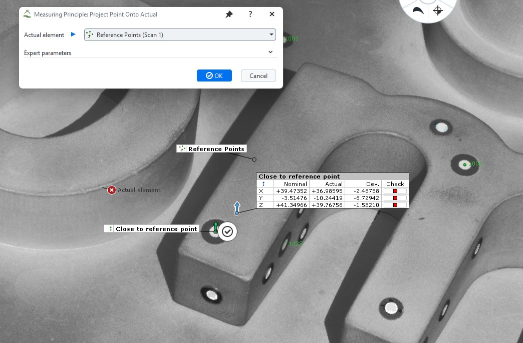 [Na...] Posted October 28 Share Posted October 28 Hi Geovany, maybe you could describe your problem a bit more detailed: What kind of spots are these? Can they be measured with the ATOS sensor? Generally the software supports adapters. You would place the adapter for let's say a cylinder into a thread on your real part. On the CAD there would be a nominal cylinder with measuring principle "Adapter" (https://techguide.zeiss.com/en/zeiss-inspect-2025/article/cmd_inspection_measure_by_any_adapter.html). You can also define adapters for points or planes for example. If you want to stick a single reference point on the spot, you could first create a nominal point close to it with measuring principle "Project point on actual". In the dialog change target from "automatic" (this would be the polygonized mesh usually) to "reference points" from the measurement series: It will be projected to the nearest point and can be checked. The result and the point it is projected on will change with the alignment. Link to comment Share on other sites More sharing options...