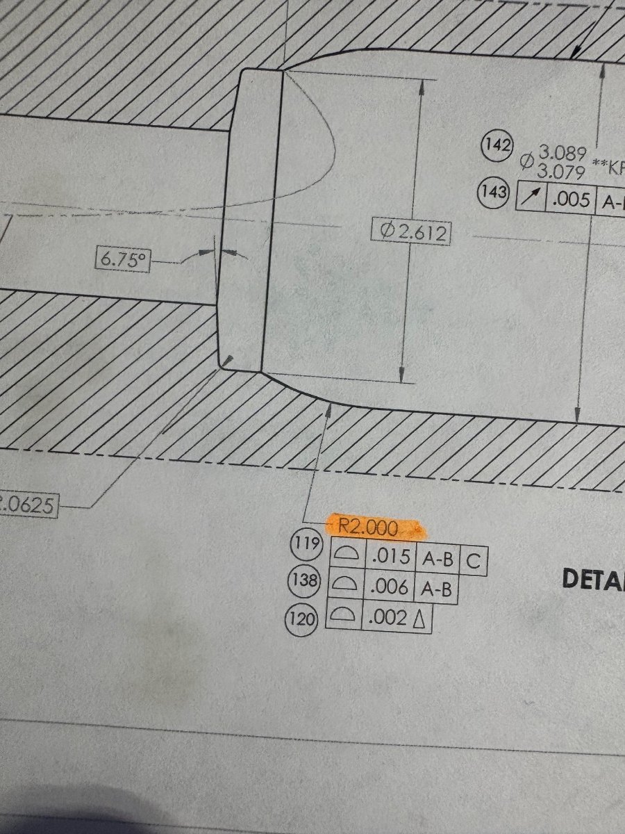 [Pa...] Posted November 14 Author Share Posted November 14 Agreed on all points. ASME calls this "dynamic" profile. It's usually a little better defined than this (new engineers like to just put profile on everything rather than take the time to dimension their drawings. This dynamic profile with no DRF controls the form of the surface, but allows the zone to "float" based on the missing definition. Here, we have engaged the customer and are asked to interpret this form control zone to "float" along with the adjacent diameter. This area is super difficult to reach. I can't share more of the pic but suffice it to say I'm coming in through a hole that barely fits a stylus which will reach the larger bores within. Once I can reach the bore, I can only touch 30degrees of the surfaces. So I use 3 seperate systems oriented 120° from one another, go in three times for each feature, and touch my 30°. As such, I'll be using line profiles; form only. Link to comment Share on other sites More sharing options...