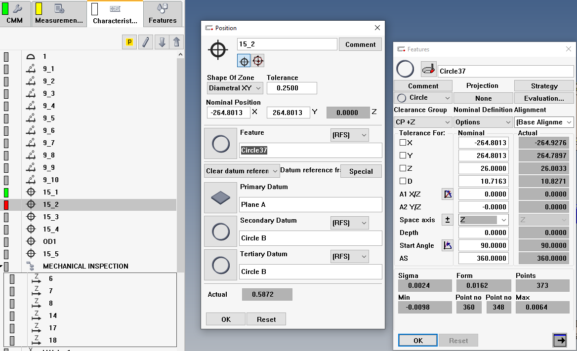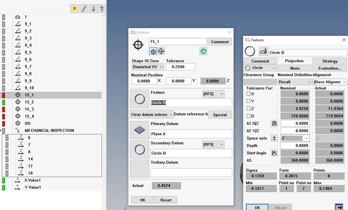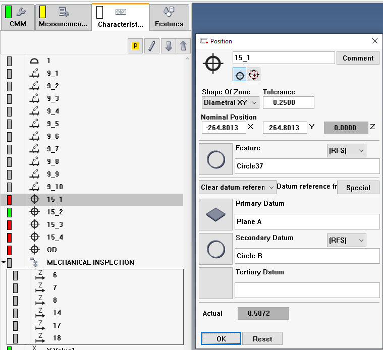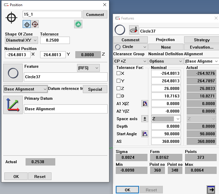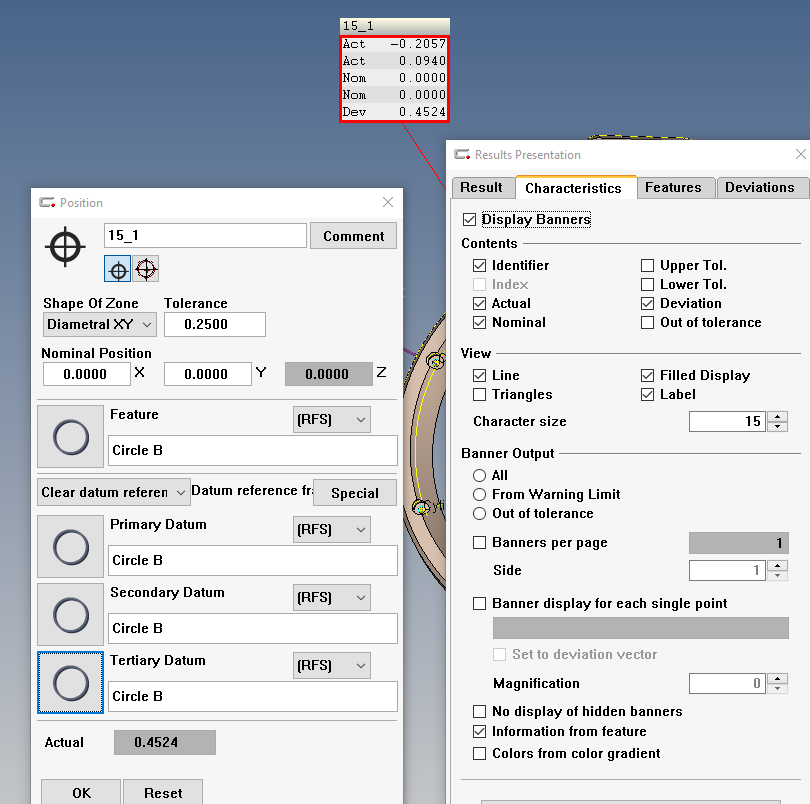 [Ra...] Posted Monday at 08:53 PM Share Posted Monday at 08:53 PM Enable the display banners for characteristics under Results Presentation through the CAD dropdown. Highlight your position characteristic, and you'll see a banner like the box on the right. It's not intuitive, at least in 2022, but if it's an XY position, the first actual is X, second is Y. You can compare the position actuals for x and y versus the feature actuals. Might help you narrow down what's happening. Or turn on "additional report" in the character settings editor. 1 Link to comment Share on other sites More sharing options...