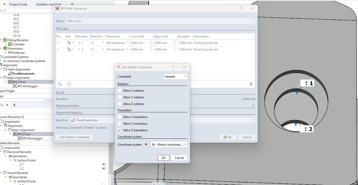 [Ma...] Posted Thursday at 11:08 AM Share Posted Thursday at 11:08 AM Good morning to all, I have a problem with RPS Alignment. I have to make a alignment between a knob and the CAD and I have a problem to block the Y rotation movement. X and Y are OK, but in Z I have to put 2 points to zero and divide the errore to the others two points. To do this I have make a first alignment where I put 1 and 2 to zero (first imagine) and a second alignment with all points, letting all the movment free exept for the X rotation (second image). The result is as visible in the third image, where it's shown the problem: the error wasn't divided in equal part. How can I do? I watch to other alignment method, but nothing seems to be useful for me. Thank you very much! Link to comment Share on other sites More sharing options...