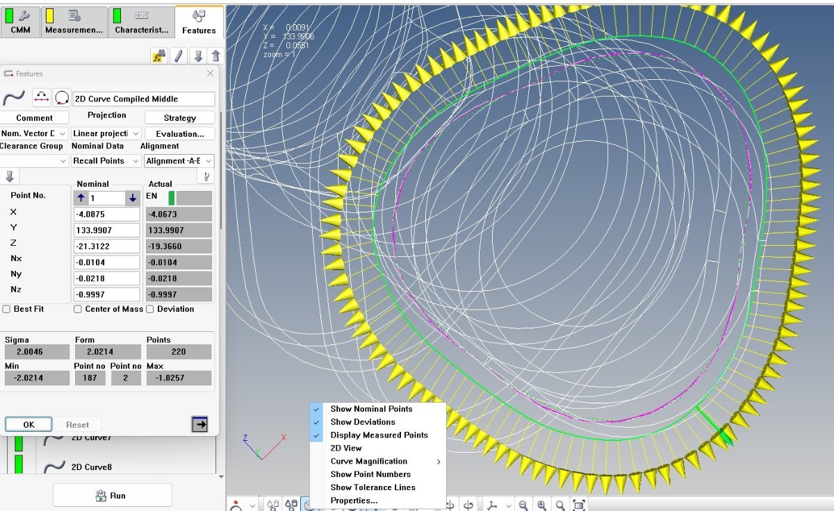 So I can go around and tackle cutting sections like this cam lobe for instance and choosing the spline it creates to measure 2D curves. I did (3) separate curve scans and recalled points into one compiled 2D curve. When I look at the graphic, it looks like the measured points (green line) and nominal points are center of ball? The small dots near lobe surface are the deviations. With the form being around 2mm I'm assuming/guessing this has to do with center of my 4mm ball?? Not sure. The profile of some of these lobes I measured on Adcole machine and the form error is with "a few microns". I've played around with the digitizing on/off and clicked stylus correction box but it just errors out the software. Any clarity as to what I'm looking at would be appreciated.