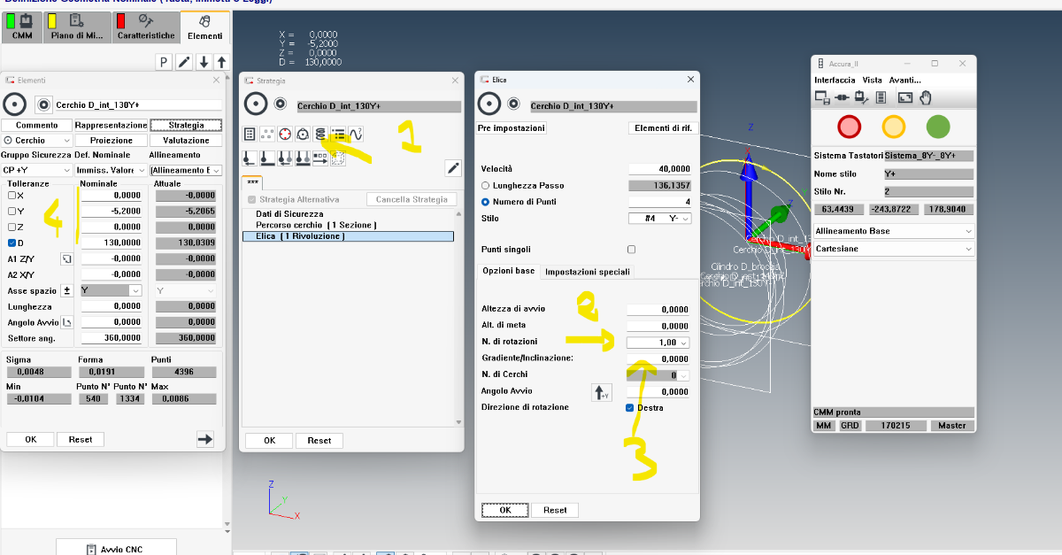 "I am not sure if this is the correct strategy, but try taking 4 points to create a circle. Then, from the strategy menu, create a helical path and enter the thread pitch in the 'gradients' field and the number of revolutions. You can change the axis distances in the element's main window (x; y; z)."