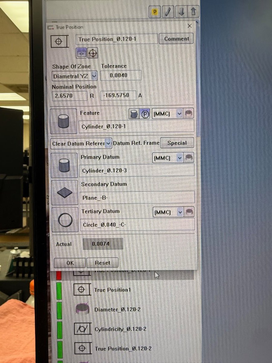 [Ka...] Posted Friday at 12:12 PM Share Posted Friday at 12:12 PM Hello everyone, I’m having an issue with my Zeiss Contura G2 when evaluating true position with MMC, and I’m hoping someone can help me understand what I might be missing. The drawing calls out true position with MMC. In Calypso, I applied MMC to the datums in the true position characteristic. However, when I generate the report, it looks like the CMM is only calculating the MMC bonus from the measured feature itself, and not from the primary or tertiary datums. I’ve attached screenshots for reference. Does anyone know why this is happening or what setting I may be overlooking? Thanks in advance for any help. Link to comment Share on other sites More sharing options...