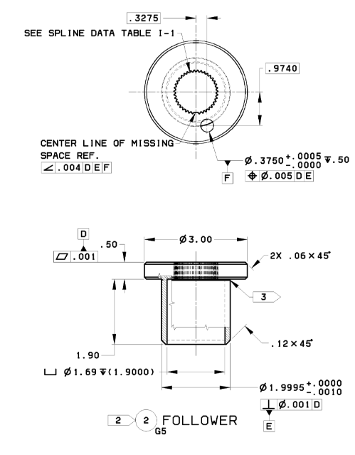 [Do...] Posted 8 hours ago Share Posted 8 hours ago Hi everyone. I wanted to get some insight into how to properly measure the angularity for the missing tooth below. Based on my method, the value in simulation is not reading zero and I am not sure where I got it wrong. I did a test run on the machine last night and was getting similar actual values, nowhere near within tolerance. How I created the program. 1. Establish datums 2. Use self centered points on either side of the missing tooth. 3. Create symmetry point from them to find center. Project symmetry point to Datum D. 4. Create intersection between Datums D and E. Project point to D plane. 5. Create 3d line between symmetry point and projected center point. 6. Repeat process for Datum F 3d line. 7. Calculate the angle as 18.58482º and create angularity characteristic for the 3d line of the tooth, referencing the 3d line of FE as primary and D as secondary. When using D as primary, I get a different theoretical value that still is not zero. I was curious about using the GDT engine for this, but do not have any experience using those new characteristics. Currently using Calypso 2023. Any help is appreciated, TIA. Link to comment Share on other sites More sharing options...