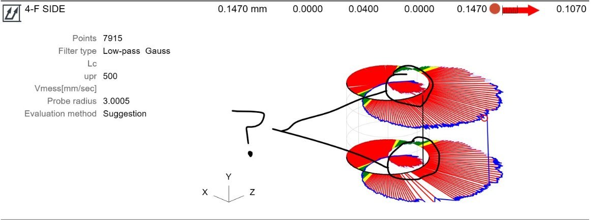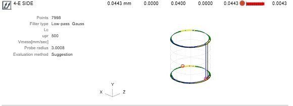 [Ma...] Posted 8 hours ago Author Share Posted 8 hours ago (edited) The value and graphics, I increased the error scaling for the post. "E side" looks great and looking at the manufactures report they seem to get a better result than i do (0.074) graphics also looks better. I would like to understand what the graphics are telling me when i see this loop. tends to happen often. Is this just normal or is something happening within? Both bores are 200mm and 30mm depth same measurement strategy, using the same datum bore. Edited 8 hours ago Link to comment Share on other sites More sharing options...